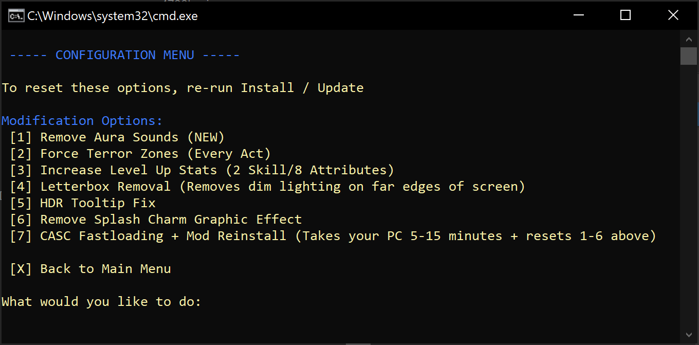 You make choices by typing the number you want & pressing enter. The launcher finds your mod version & game's location and displays this too.