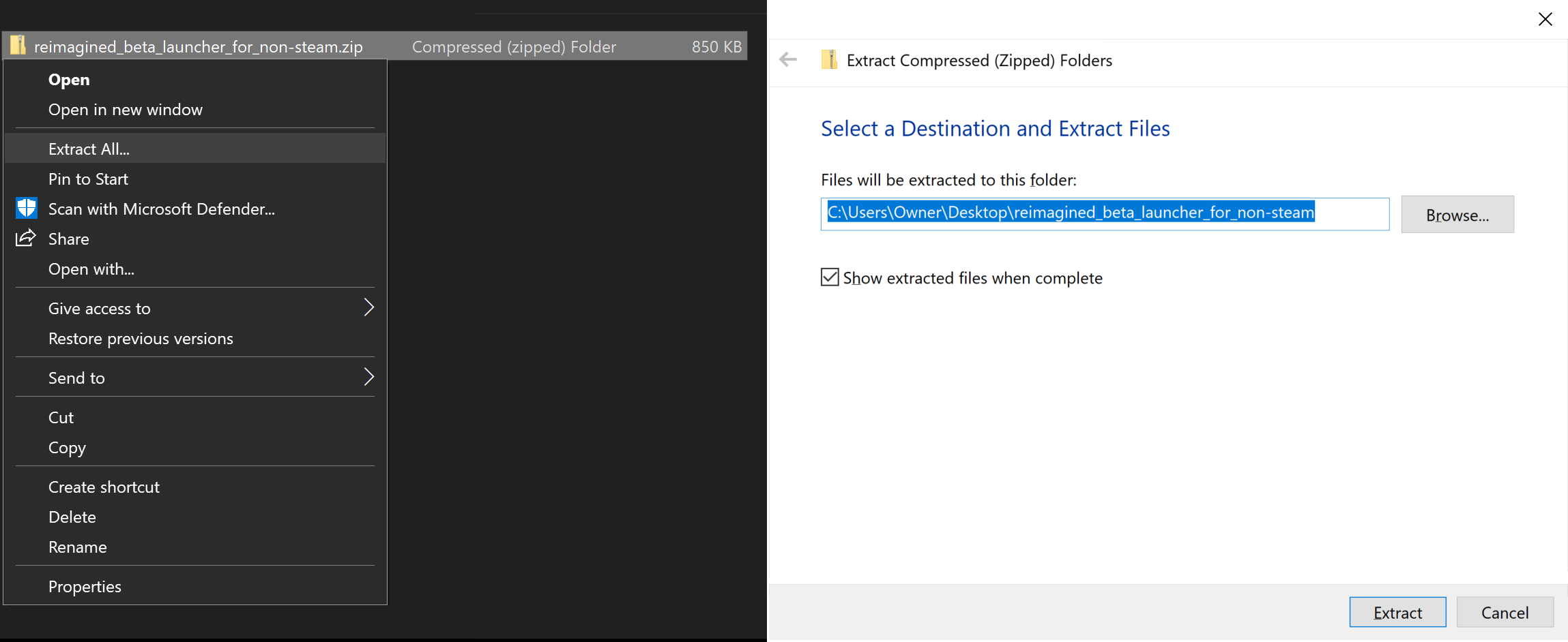 2. Right click the ZIP file & click ‘Extract All…’ and on the next box that pops up click the ‘Extract’ button. You can rename the Launcher's folder to anything you want & run it from anywhere.