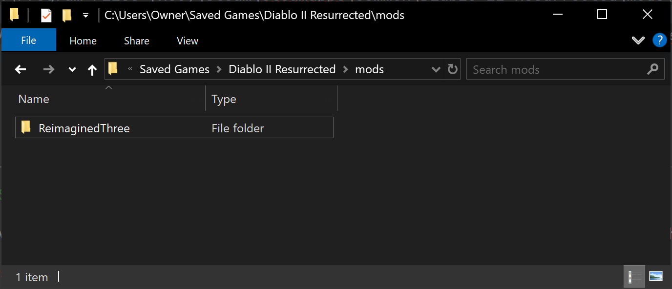 2. Go back one directory to the \Saved Games\Diablo II Resurrected\mods\ folder which contains the saved games for each mod as shown in the picture below.