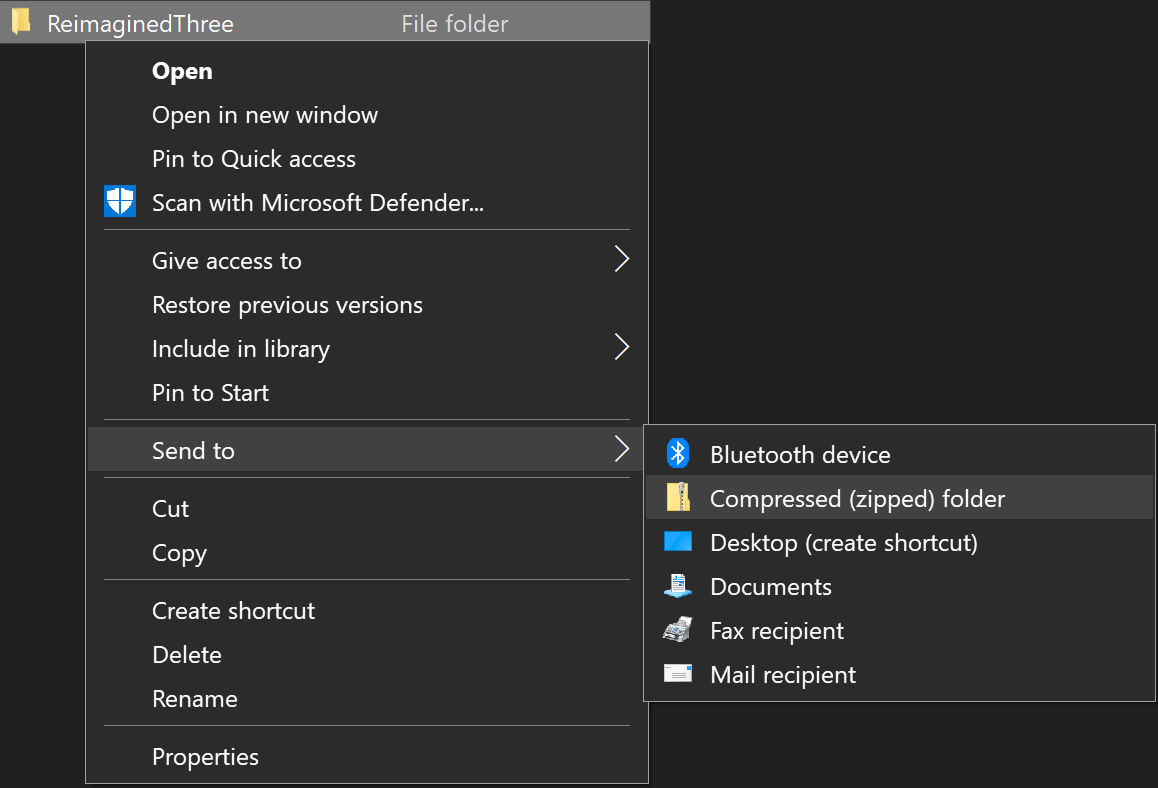 3. As shown in the picture right click on the ReimaginedThree folder, select ‘Send to’ and choose ‘Compressed (zipped) folder’ which copies the contents into a ZIP file. Rename the ZIP file to something memorable, and move it somewhere easy to remember (e.g. your desktop).