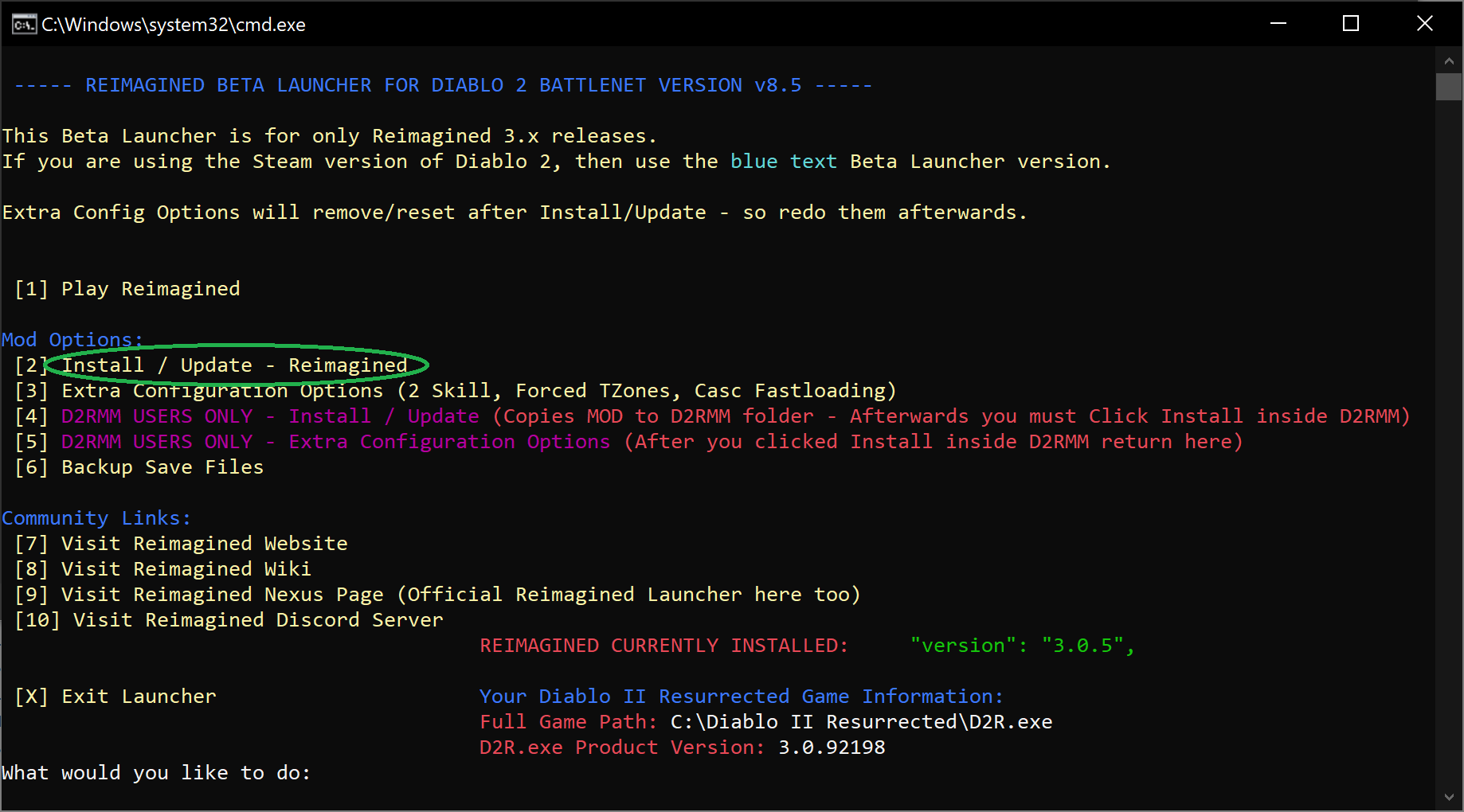 4. For Installing Reimagined as shown inside the green circle below choose: Install / Update - Reimagined.