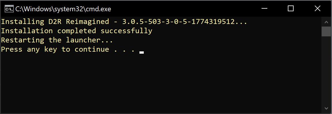 The launcher D2RLaunch created by the D2R Modding team who created and maintain the D2R mod ReMoDDeD works fine with Reimagined and can be used to launch and play the mod after installation is completed.